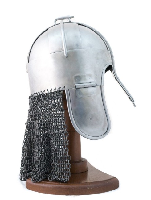 This crested head protection is completely handcrafted. We do recommend to wear it together with mail aventail for better protection.