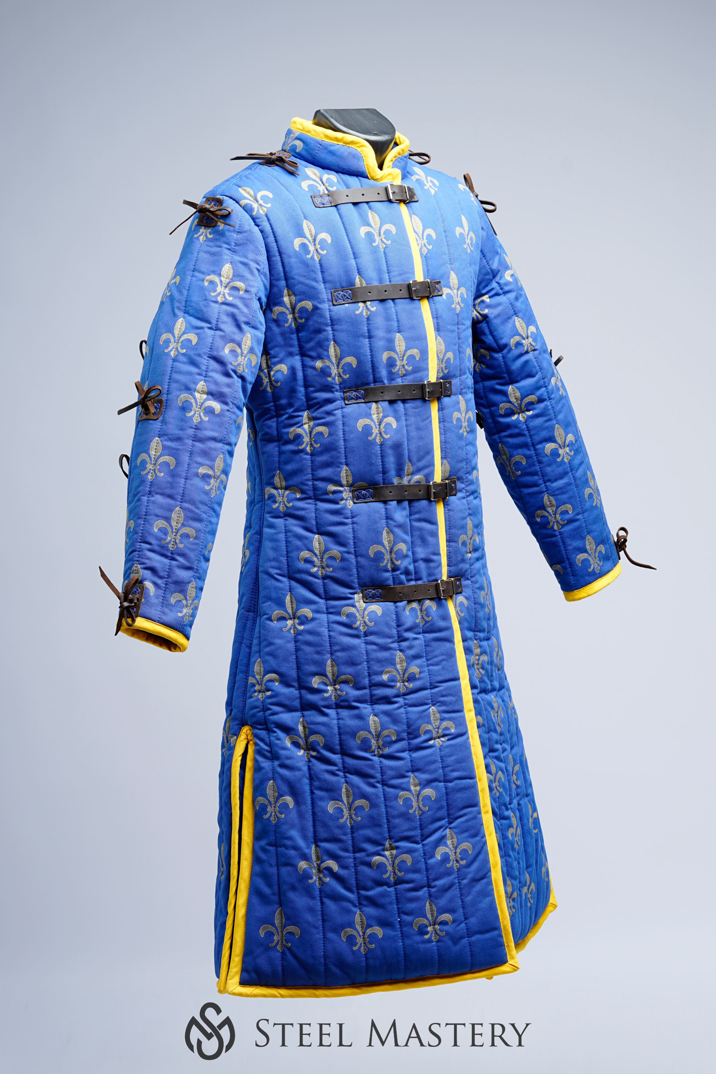 Outer material of gambeson armor always showed social status and financial health of owner. So, poor soldiers were wearing linen or cotton gambeson. Rich and noble knight could afford silk, wool or leather gambeson. Various types of fastening were used as well: leather belts with cast buckles, metal buttons, straps with steel or brass points. Bottom edge could be decorated with festoons.