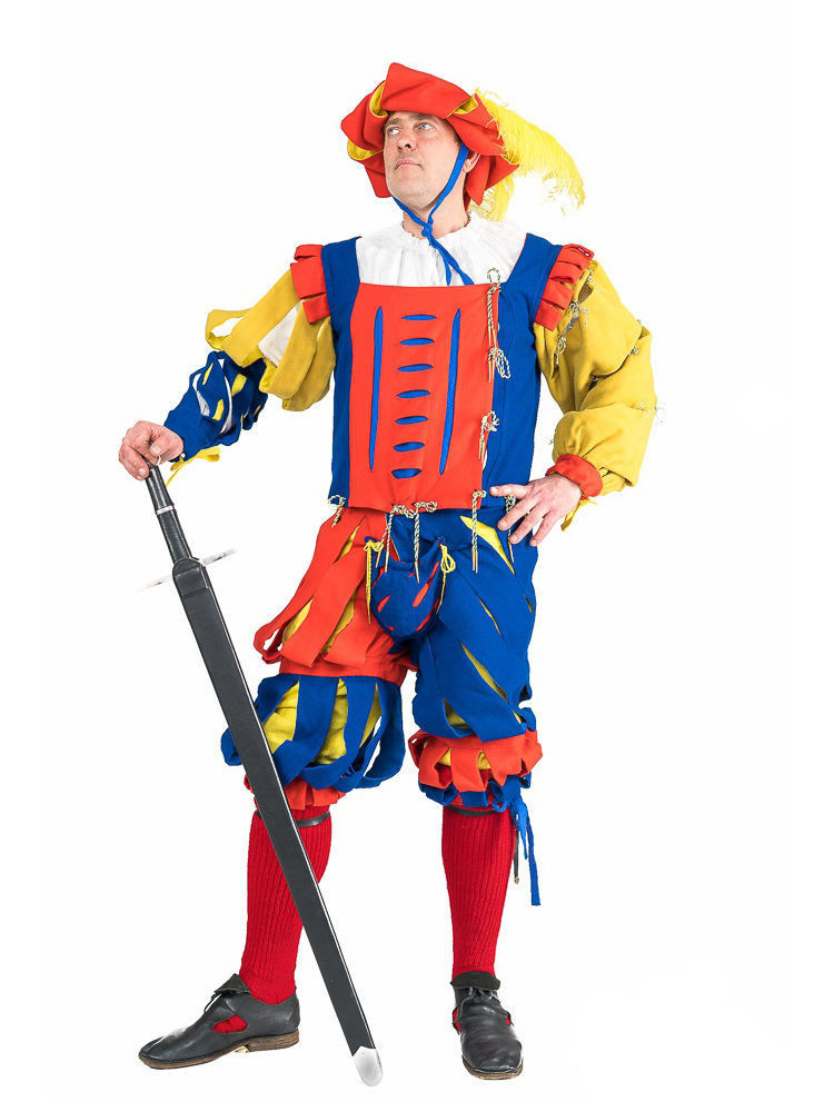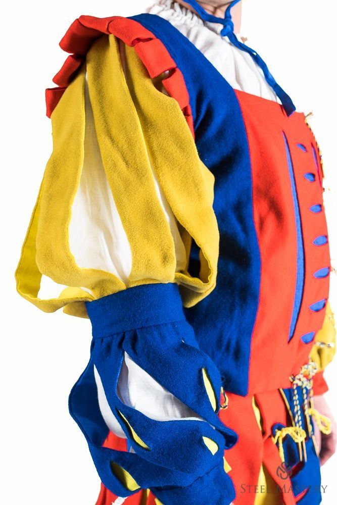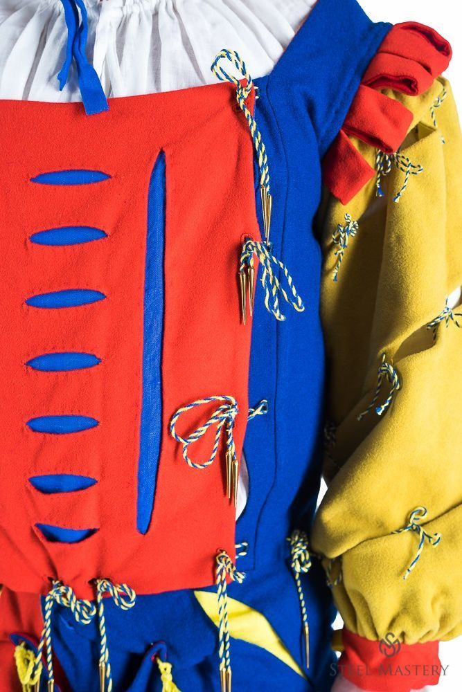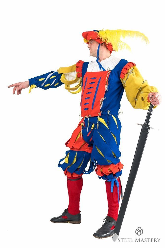 This garb of medieval German soldier combines the most typical features: bright coloured fabrics, slashes, cuts, puffed sleeves.