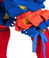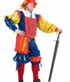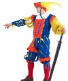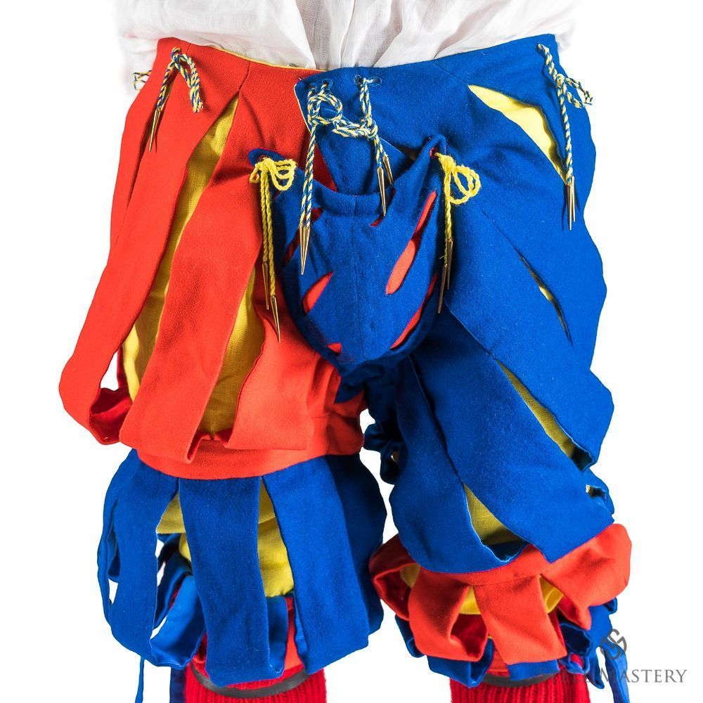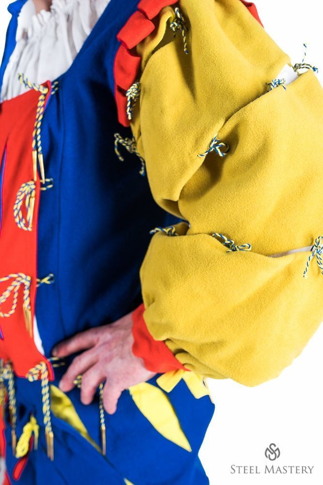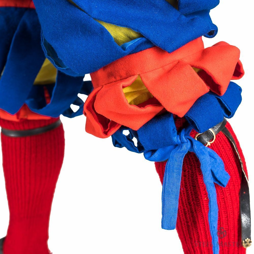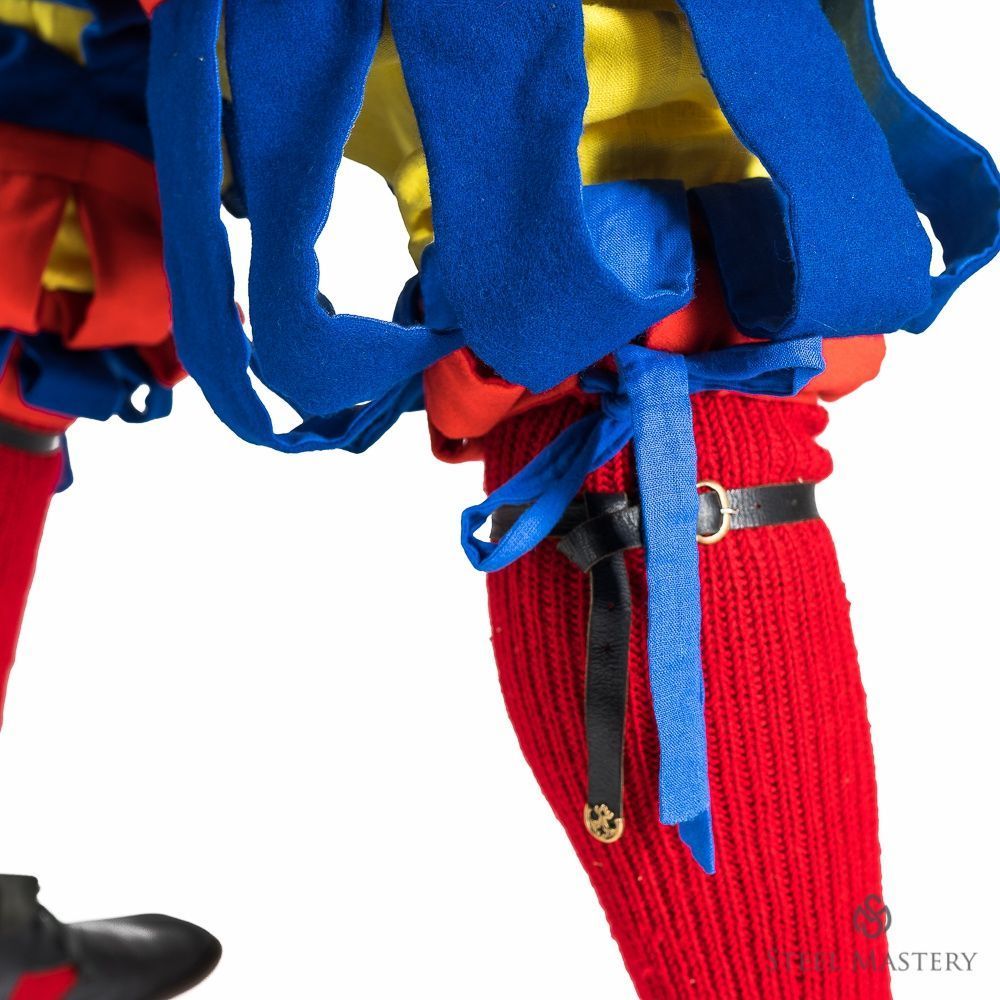 This garb of medieval German soldier combines the most typical features: bright coloured fabrics, slashes, cuts, puffed sleeves.