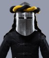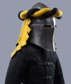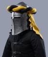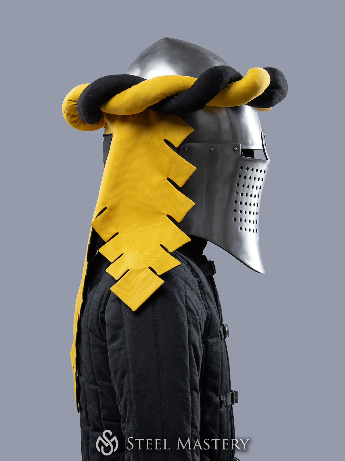 A distinctive medieval headpiece featuring a twisted torse and a long mantle with a tapered tail. The sculptural form and dynamic silhouette reflect heraldic and late medieval visual traditions, making it a striking addition to historical outfits.