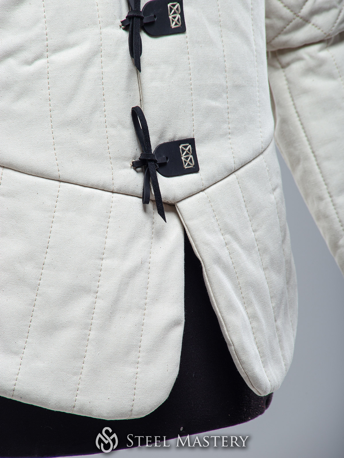 So, by choosing what piece may we offer you from the men’s wardrobe of the middle of the XV century, we could not leave out a farsetto. After analyzing of the existing graphical sources and descriptions, Steel Mastery crafters took the best from the each and recreated the generalized look of the perfect arming doublet – farsetto, which is appropriate in any corners of XV century Europe. Short tight silhouette, narrow sleeves with puffs, short and tough collar. We decided to fasten men’s doublet farsetto with light brown leather belts with stylish cast buckles of golden color. However, by your regards, we may replace them with buttons or leather laces. This classy padded doublet is decorated with vertical stitching and puffs – with contrast diamond-shaped stitching.