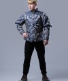 Silhouette in a shape of triangle with wide shoulders and thin waistline was achieved with tight fit of farsetto on the body and splendid puffs on the upper part of sleeves.