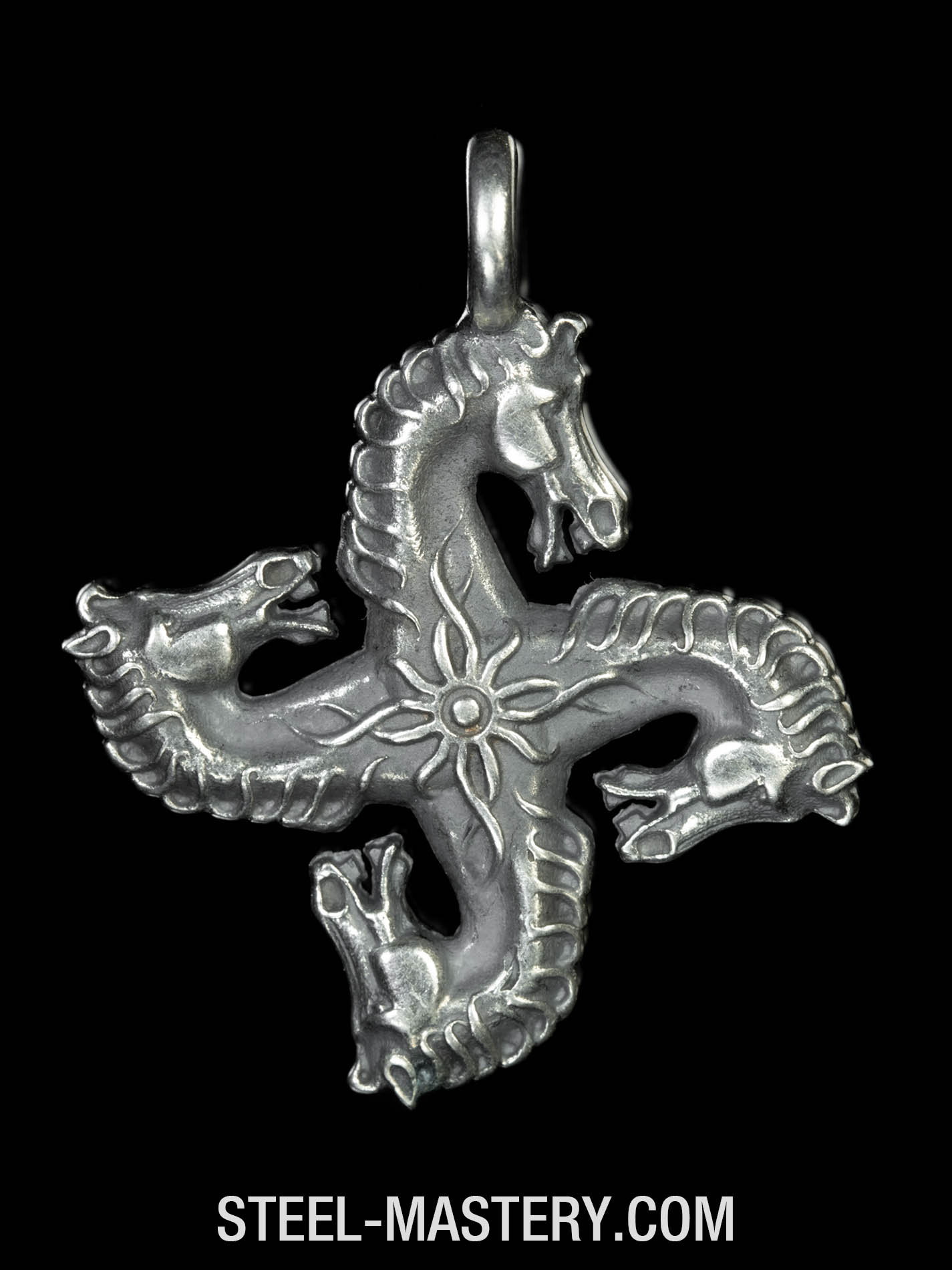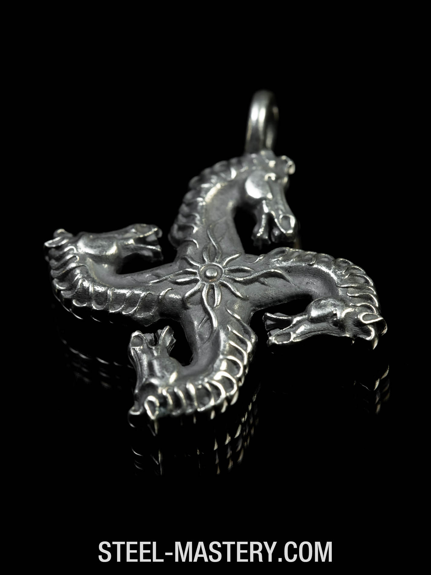 Cool handmade pendant in the form of swastika – Sun symbol. Four horses pulling a sun chariot across the sky as the symbol of eternal movement. Swastika with horse head shaped terminals was popular in the Balkan-Danubian provinces of the Roman Empire. It was a quite popular military jewelry in 2nd–4th centuries AD throughout Thracians princely and still looks interesting today. Stylish manly pendant – original and cool looking.