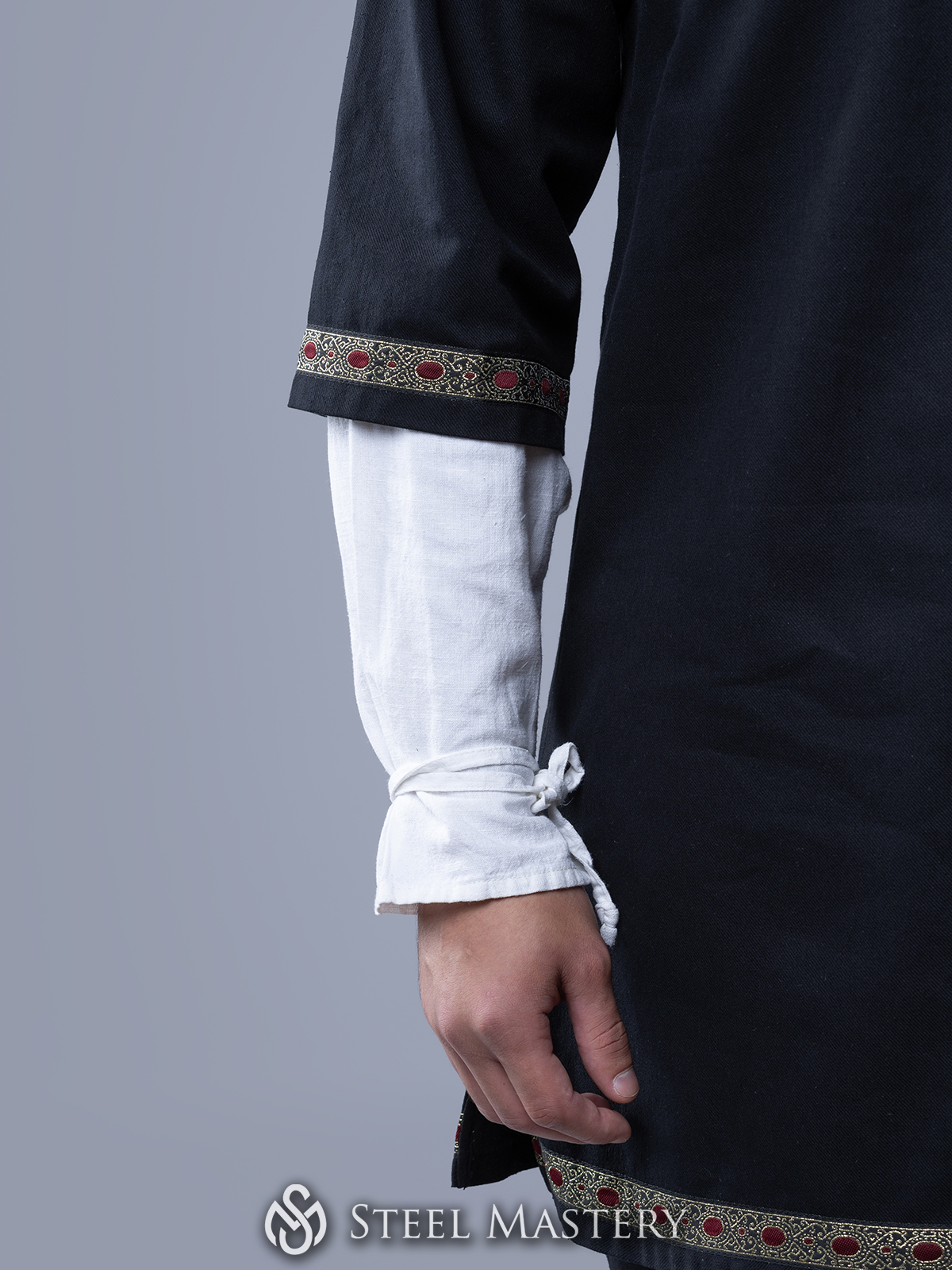 Men of the XIV-XV centuries wore both fitted cotardies with a lot of buttons, and long tunics, that were worn over the chemise.